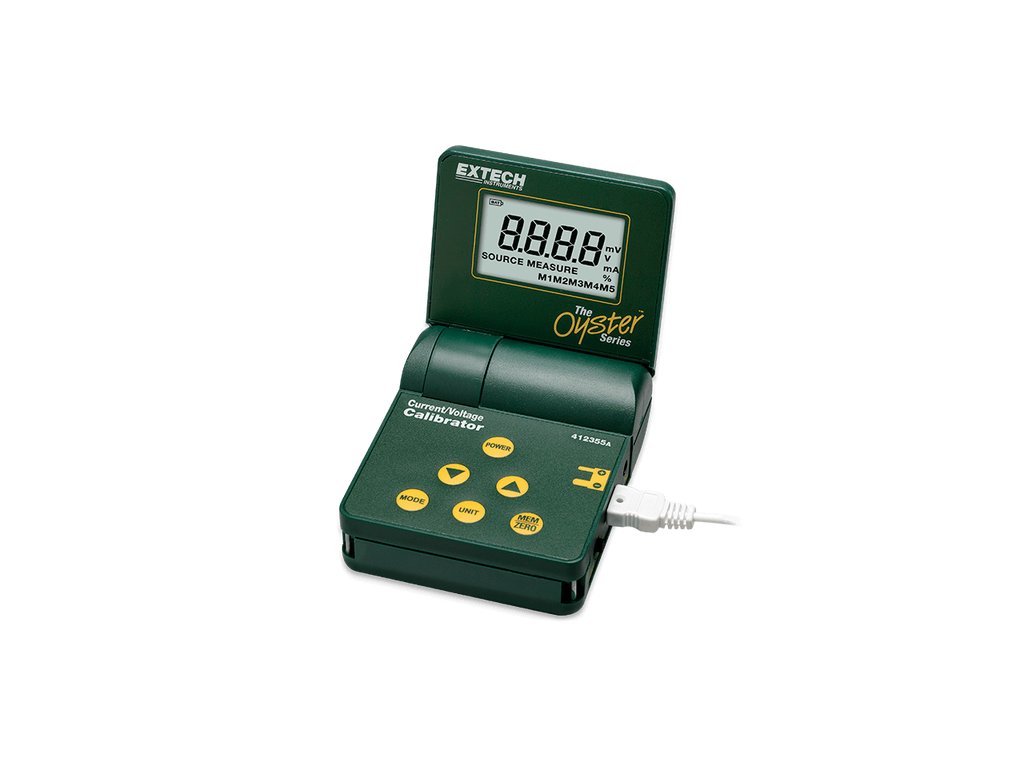 412355A je kalibrátor a merač prúdu a napätia. Presný zdroj na kalibráciu procesných zariadení a meranie jednosmerných procesných signálov od 0 do 24 mA alebo ako mV v napäťových rozsahoch so super veľkým LCD, ktorý zobrazuje hodnoty v mA, ako percento z rozsahu 0 až 24 mA alebo ako mV v napäťových rozsahoch. Medzi ďalšie funkcie patrí dotyková klávesnica a päť uložených kalibračných hodnôt pre rýchle kalibrácie. Kompletný s kalibračným káblom s koncovkami, puzdrom na prenášanie, popruhom na krk a sieťovým adaptérom.