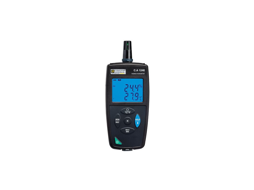 Teplomer/vlhkomer. Rozsah merania teploty: -10 až +60°C, Rozsah merania vlhkosti:10-90%, integrovaná sonda, pamäť 1M, Bluetooth, USB