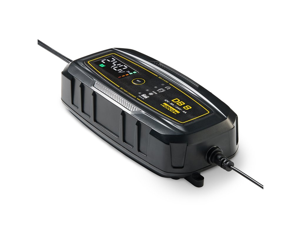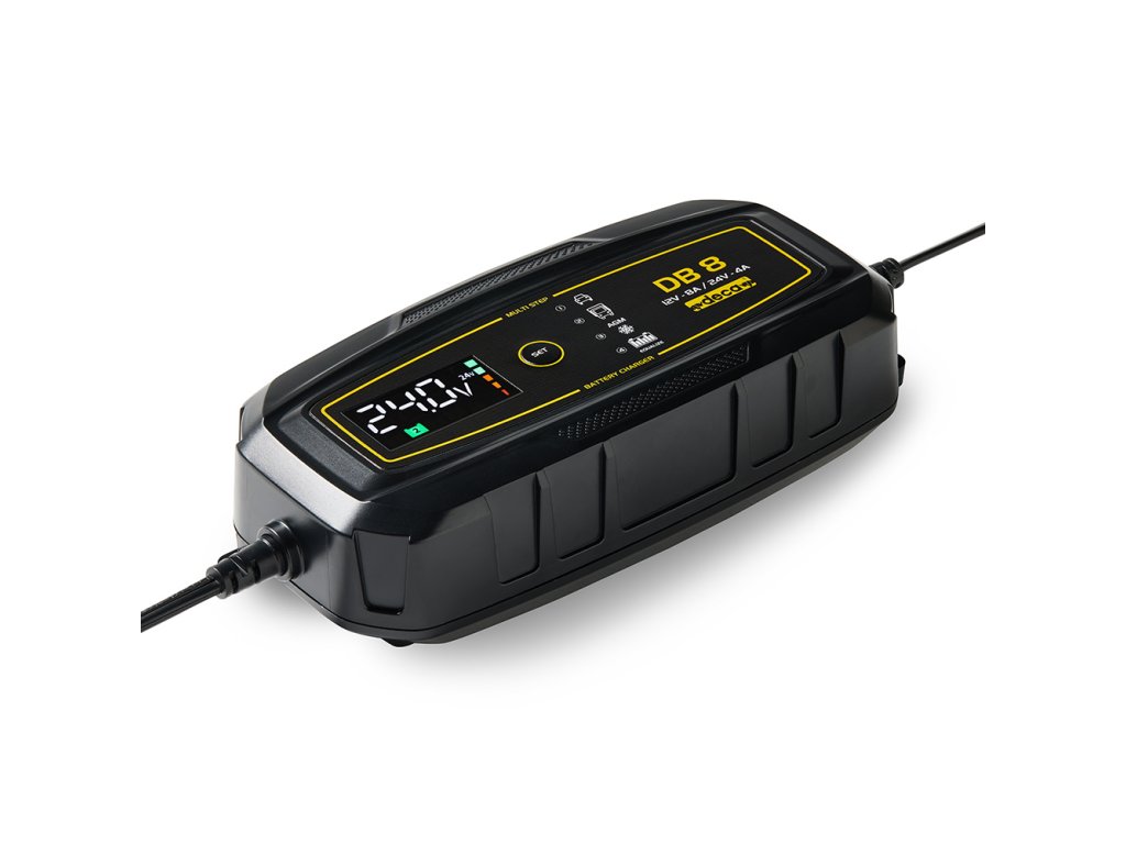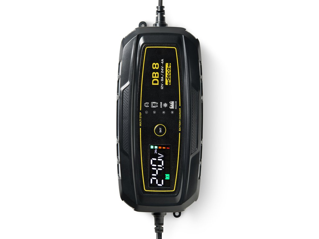 Nabíjačka akumulátorov Deca DB 8 (12V/8A-24V/4A) je spoľahlivý, praktický a kompaktný prístroj. Je vhodná pre 12V a 24V batérie s kapacitou od 8 do 180 Ah typu WET, EFB, MF, Ca/Ca, AGM, GEL a Start&Stop. Je intuitívna a ľahko použiteľná, a to vďaka praktickému displeju, ktorý zobrazuje stav nabitia akumulátora a zvolený nabíjací program.