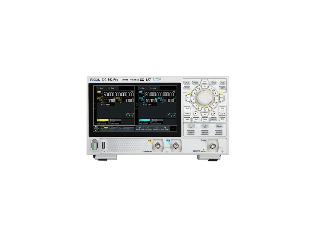 Model DG852 Pro je 2-kanálový generátor funkcií / ľubovoľných tvarov signálu so šírkou pásma 1 μHz až 50 MHz, vzorkovacou frekvenciou 625 MSa/s, rozlíšením 16 bitov, hĺbkou pamäte 2 Mpts (voliteľne 8 Mpts), rozsahom amplitúdy 1 mVpp až 20 Vpp (vysoká impedancia), dotykovým displejom s uhlopriečkou 17,8 cm (7").