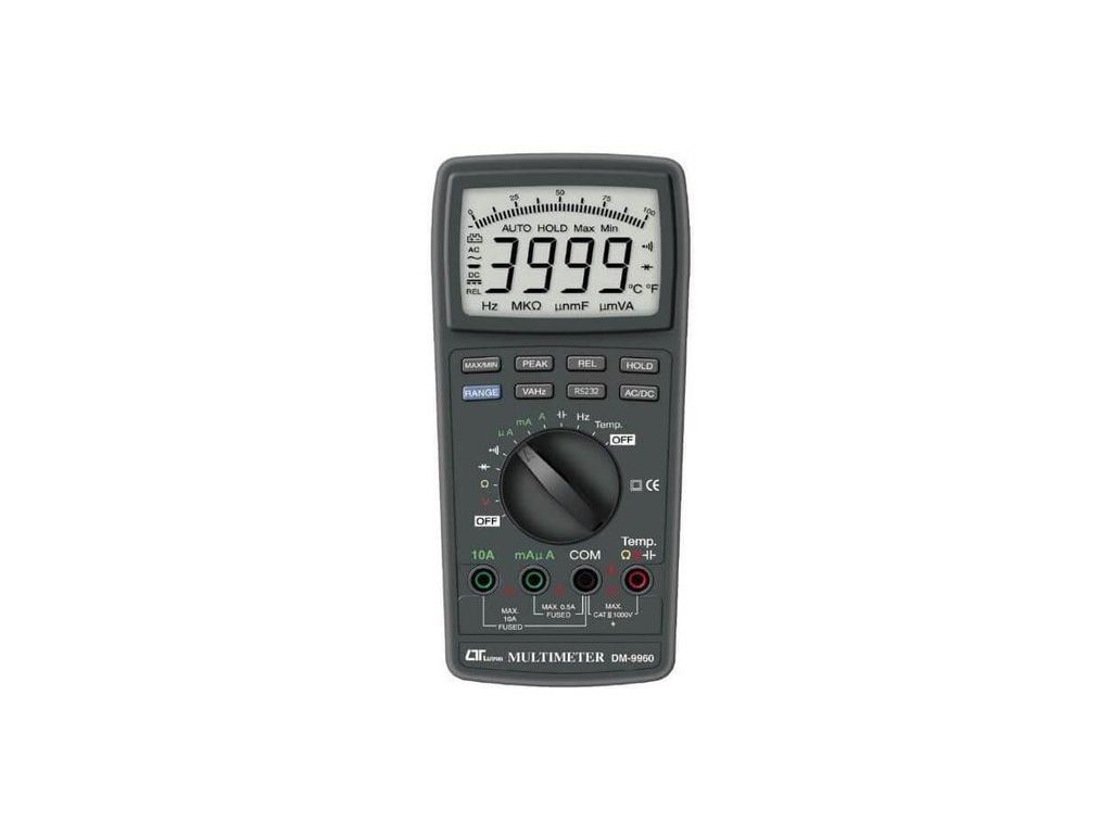 Digitálny multimeter pre kategóriu CAT III 1000V. Veľký displej s bargrafom uľahčuje prečítanie nameranej hodnoty. Merua napätie, prúd, odpor, kapacitu, frekvenciu, teplotu, diódy, spojitosť. Umožňuje on-line pripojenie k PC s optickým oddelením (potrebné dokúpiť SW-9960 a RS232 kábel UPCB-06).