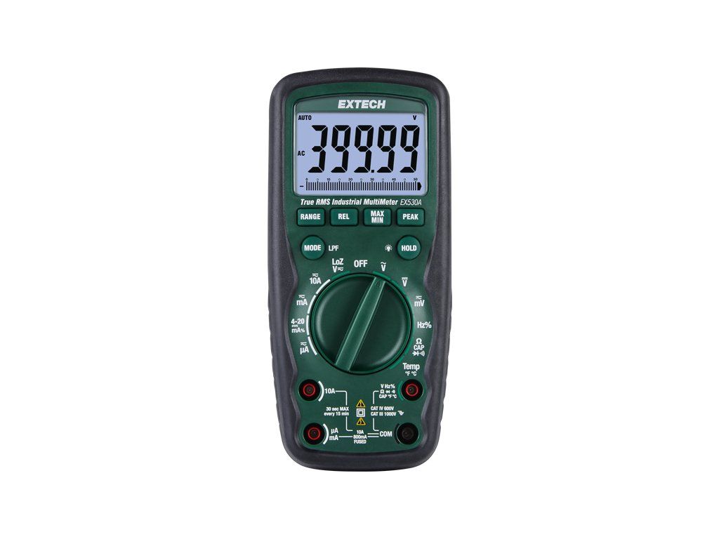 Multimeter EX530A je ideálny na použitie vonku, na lodiach a v akomkoľvek náročnom priemyselnom prostredí. Je vodotesný podľa štandardu IP67, má dvojito lisované puzdro a je odolný voči pádu z výšky až 2 m s bezpečnostnou triedou CAT IV-600 V. Meria striedavé/jednosmerné napätie a prúd, odpor, kapacitu, frekvenciu, teplotu, slučku 4 až 20 mA a pracovný cyklus.