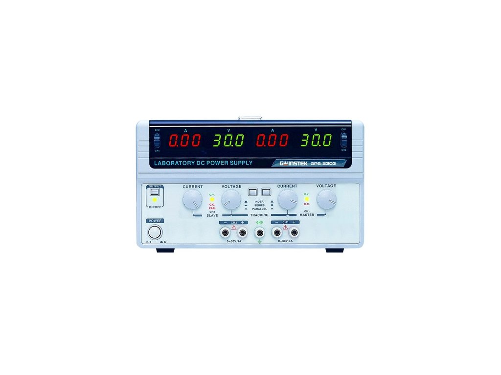 Napájací zdroj 2x 0-30V/ 3A. Umožňuje paralelné (0-30V/6A) a sériové (0-60V/3A) radenie kanálov.
