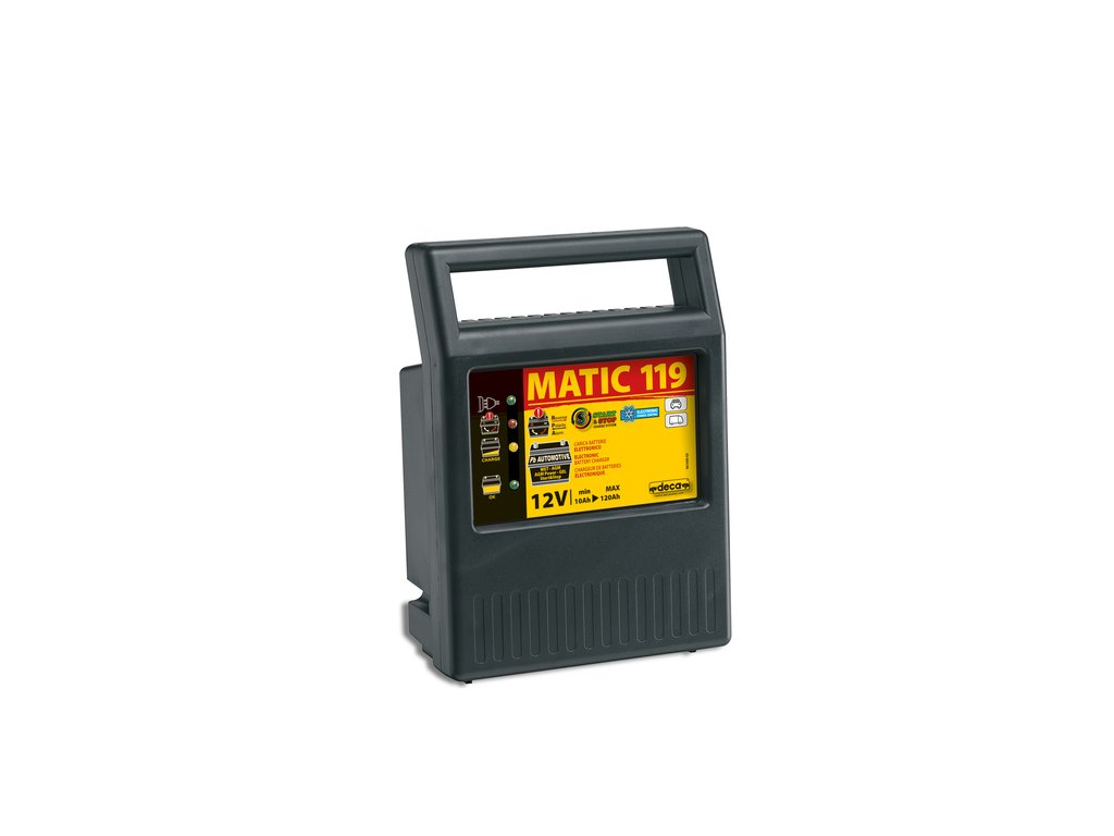 MATIC 119 - prenosná automatická 12V-6A nabíjačka olovených, bezúdržbových (MF), AGM, gélových akumulátorov. Výrobca firma DECA. Nabíjačka MATIC 119 je vhodná pre nabíjanie autobaterií a motocyklových akumulátorov kapacity 10Ah - 120Ah.