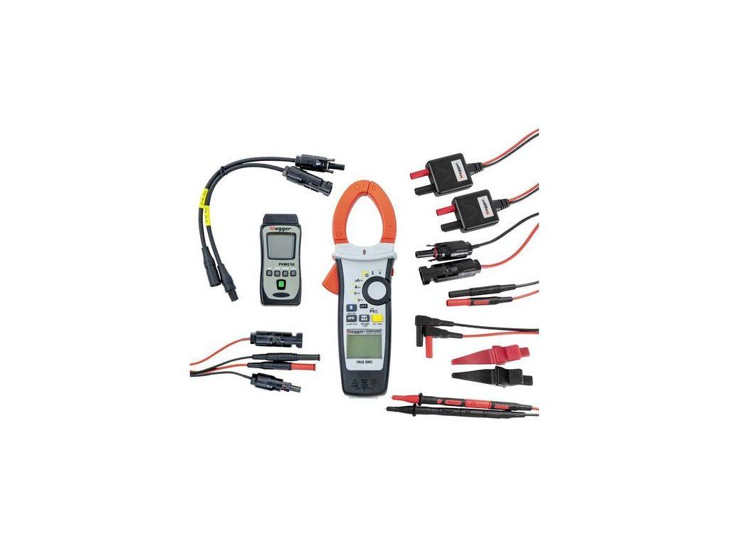 Fotovoltická súprava PVK350 ponúka základné nástroje pre solárnych profesionálov. Súčasťou balenia je solárny kliešťový merač Megger DCM1500s, merač intenzity ožiarenia PVM210 a špecializované solárne testovacie káble, úhľadne usporiadané v odolnom pevnom puzdre.