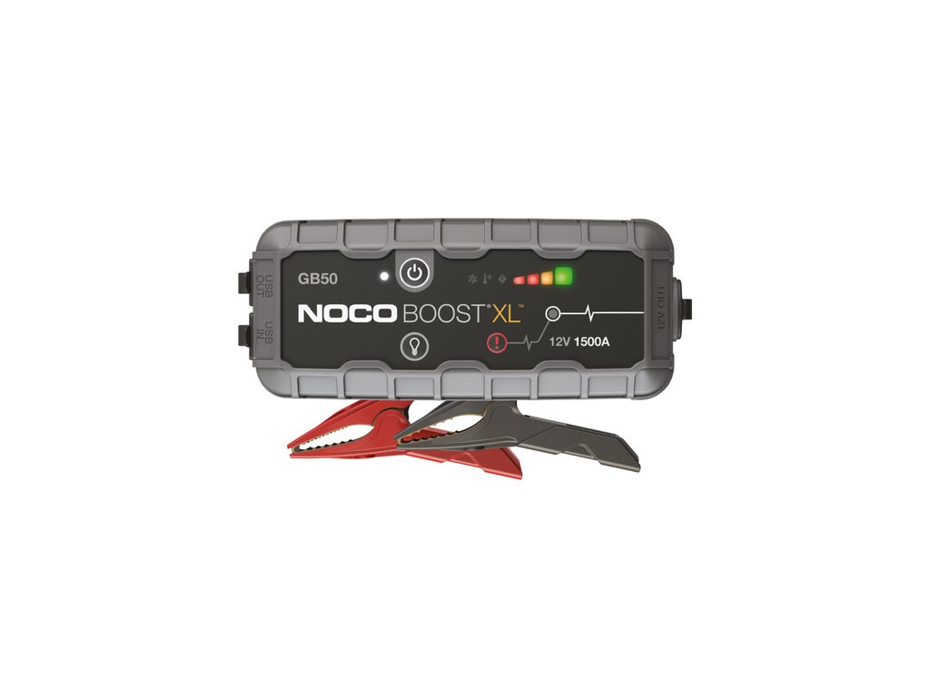 NOCO GB50 pomocné prenosné štartovacie zariadenie. Výrobca NOCO. Výhradné zastúpenie spoločnosť MICRONIX spol. s r.o. GB50 slúži ako pomocné štartovacie zariadenie pre núdzové štartovanie malých osobných automobilov, motocyklov, štvorkoliek, kosačiek a pod. reálnym prúdom až 300A v RUČNEJ prevádzke (batéria pod 2V), inak pomocný štartovací prúd je 160A (platí pre vybitú nie vadnú batériu).