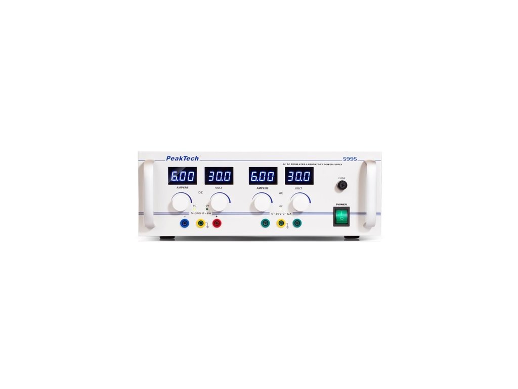 Tento laboratórny zdroj AC/DC má dva samostatne nastaviteľné výstupy, ktoré dokážu podávať AC/DC napätie od 0 do 30 V, ako aj DC/AC prúd 0 - 6 A. Na dvoch samostatných 3-miestnych LED displejoch je možné presne odčítať výstup AC/DC napätia a AC/DC prúdu. Vďaka možnostiam, ktoré toto zariadenie ponúka, je vhodné aj na údržbu malých AC obvodov, transformátorov a svetiel.