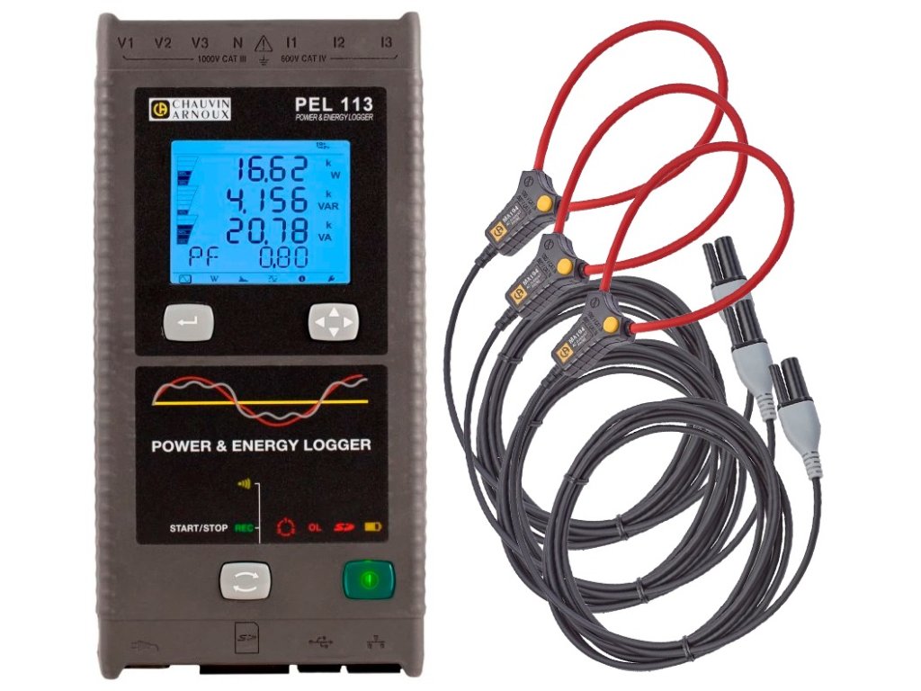 Záznamník PEL113, navyše s 3ks prúdovými prevodníkmi MA194-350 a adaptérom pre napájanie prístroja z meraného obvodu.