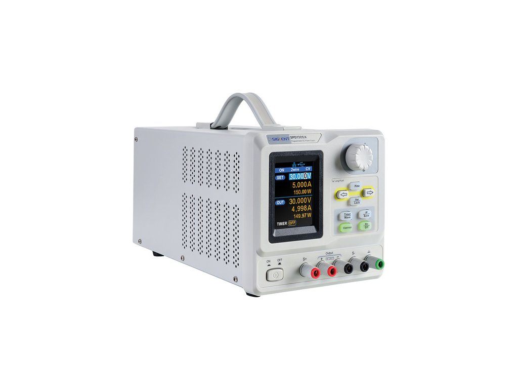 Jednokanálový programovatelný zdroj SPD1305X s výkonem až 150W; 0~30V/0~5A; malé zvlnění: <350 µVrms/3mVpp; rychlá odezva: <50µs; minimální rozlišení 1mV/1mA; Přesnost napětí: ±(0,03% ze čtení+10 mV); Přesnost proudu: ±(0,3% ze čtení +10 mA). Čtyřvodičová kompenzace (max. 1V). Standardní ochrany OVP / OCP / OTP; funkce časování; 2,8" TFT displej; USB, LAN. Včetně PC software: Easypower, podpora SCPI, LabView driver.